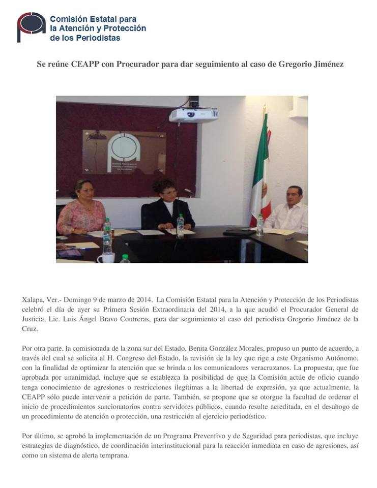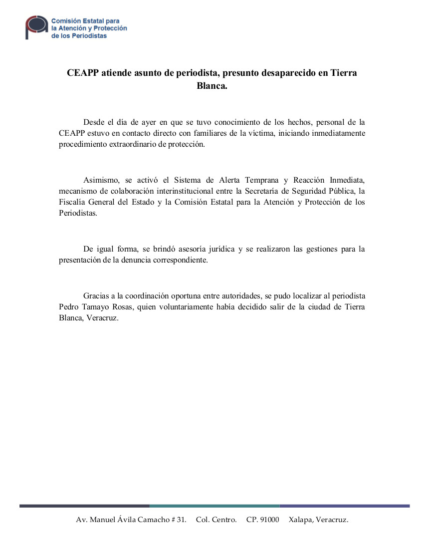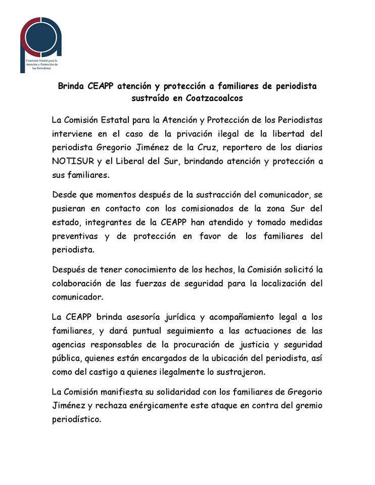 CEAPP atiende asunto de periodista, presunto desaparecido en Tierra Blanca.