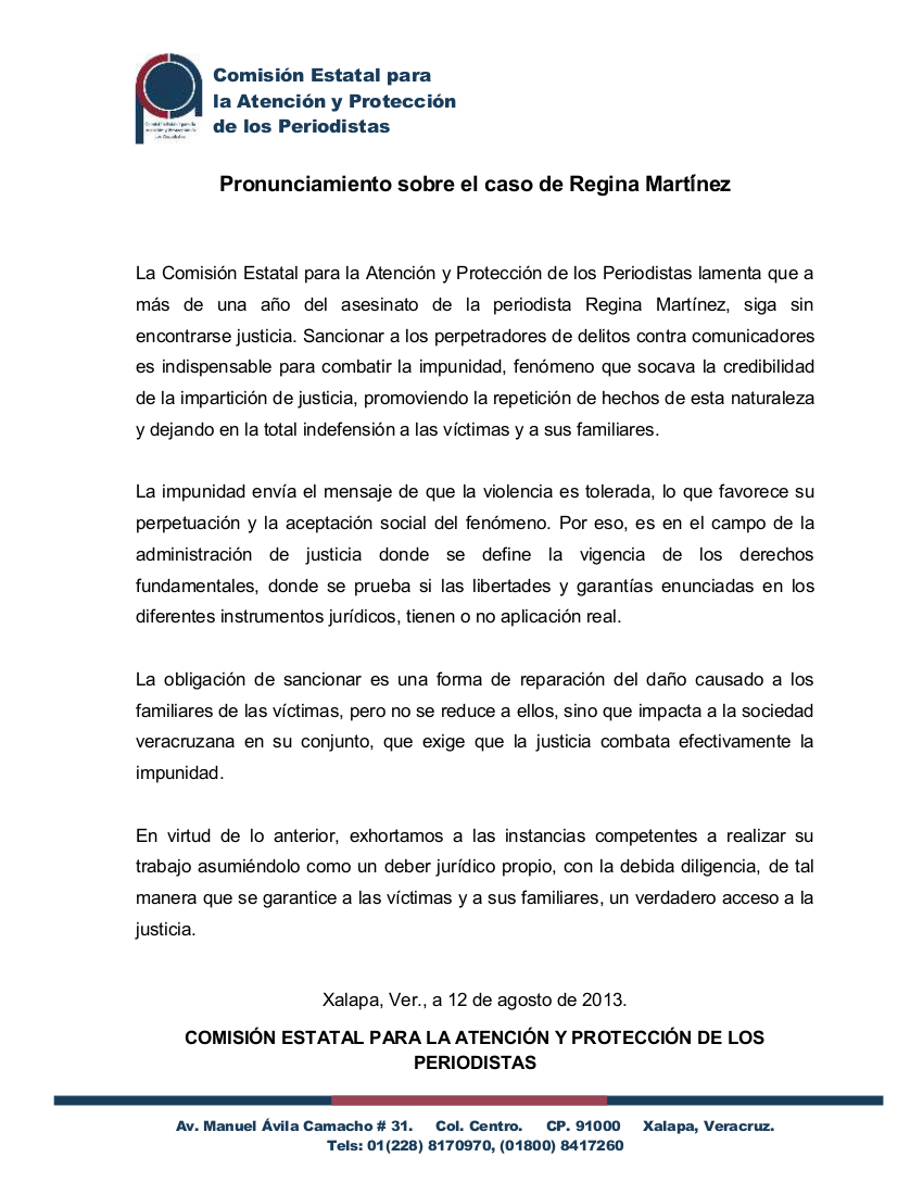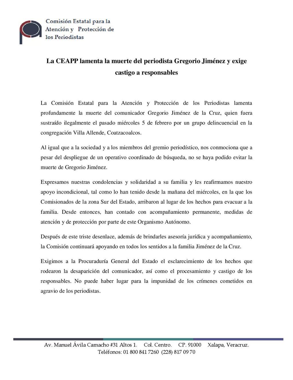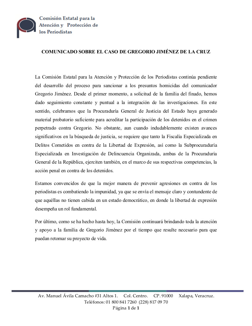 COMUNICADO SOBRE EL CASO DE GREGORIO JIMÉNEZ DE LA CRUZ