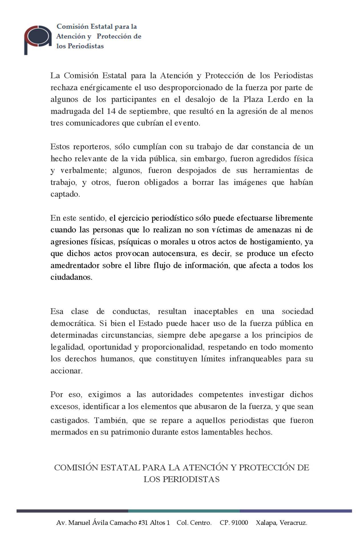 CEAPP rechaza enérgicamente el uso desproporcionado de la fuerza por parte de algunos de los participantes en el desalojo de la Plaza Lerdo