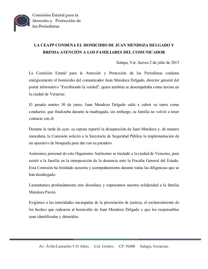 LA CEAPP CONDENA EL HOMICIDIO DE JUAN MENDOZA DELGADO Y BRINDA ATENCIÓN A LOS FAMILIARES DEL COMUNICADOR