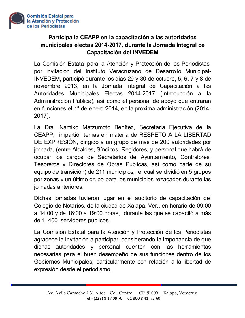 Participa la CEAPP en la capacitación a las autoridades municipales electas 2014-2017, durante la Jornada Integral de Capacitación del INVEDEM