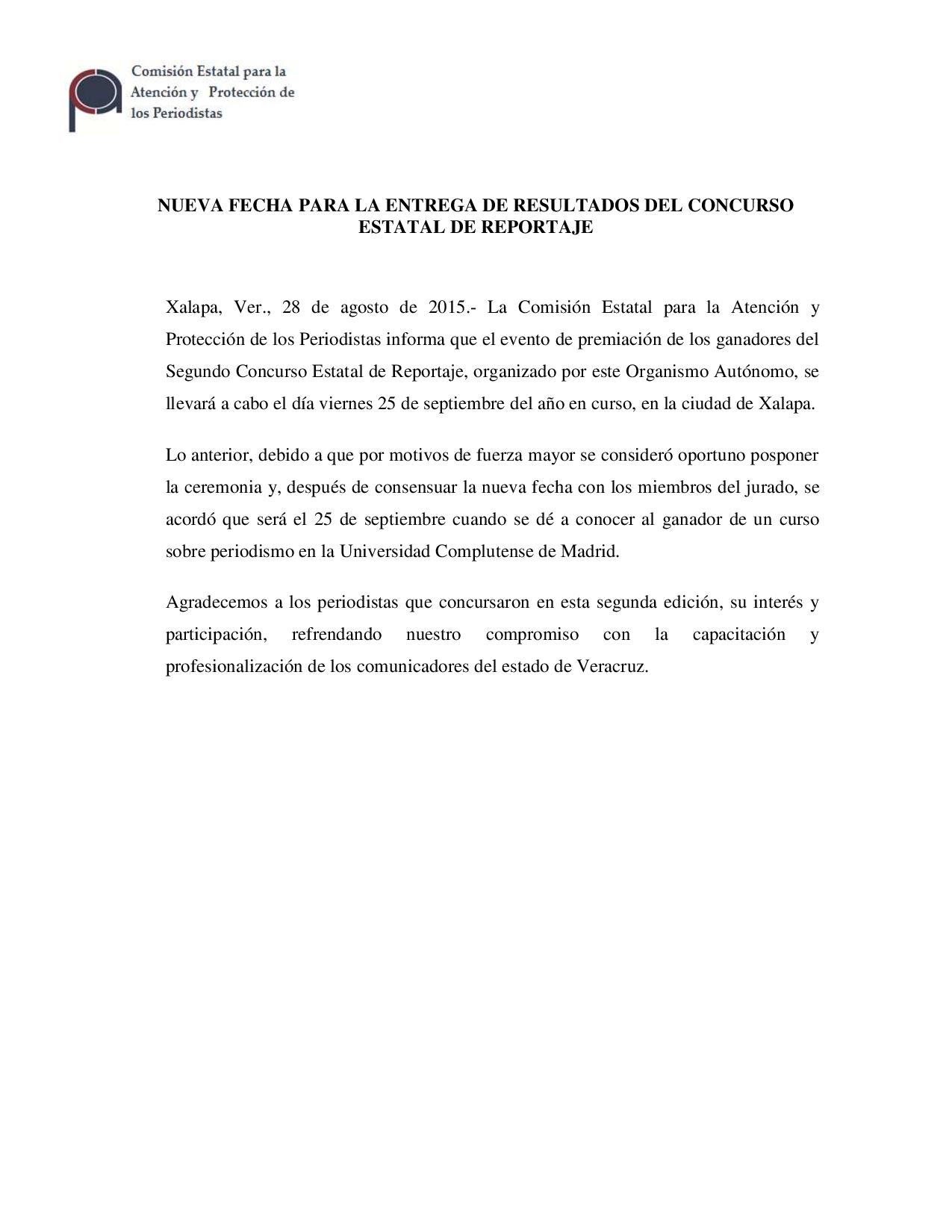 NUEVA FECHA PARA LA ENTREGA DE RESULTADOS DEL CONCURSO ESTATAL DE REPORTAJE