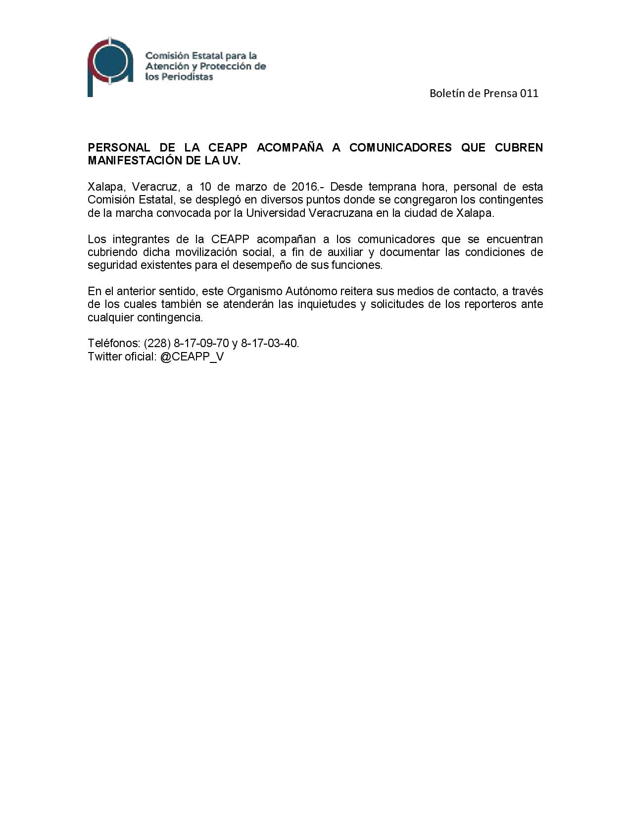 PERSONAL DE LA CEAPP ACOMPAÑA A COMUNICADORES QUE CUBREN MANIFESTACION DE LA UV.
