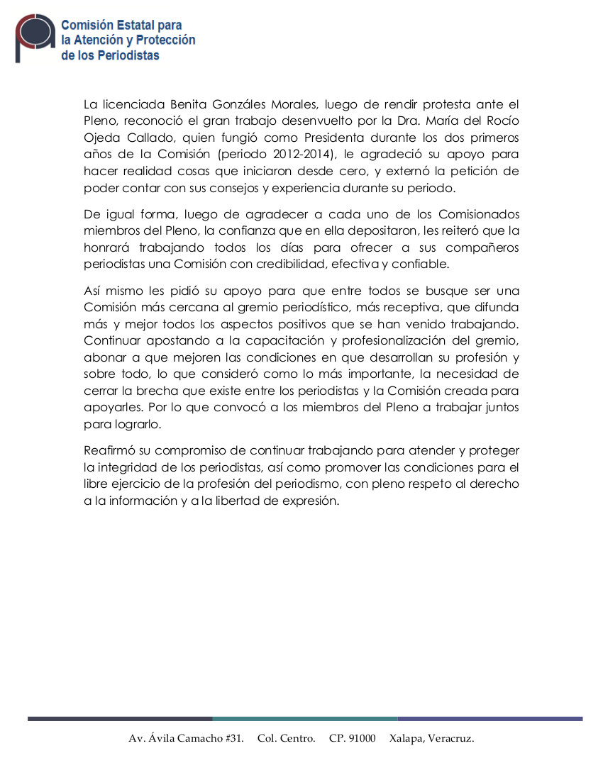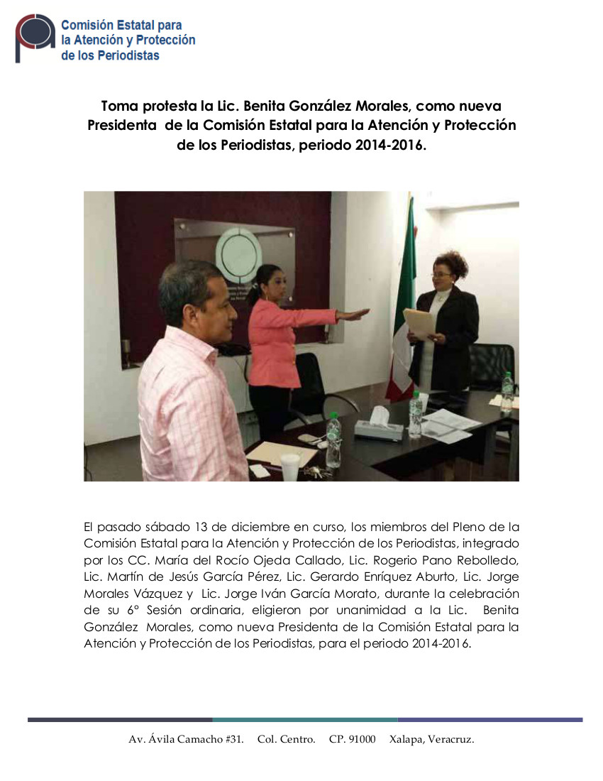 Toma protesta la Lic. Benita González Morales, como nueva Presidenta de la Comisión Estatal para la Atención y Protección de los Periodistas, periodo 2014-2016.