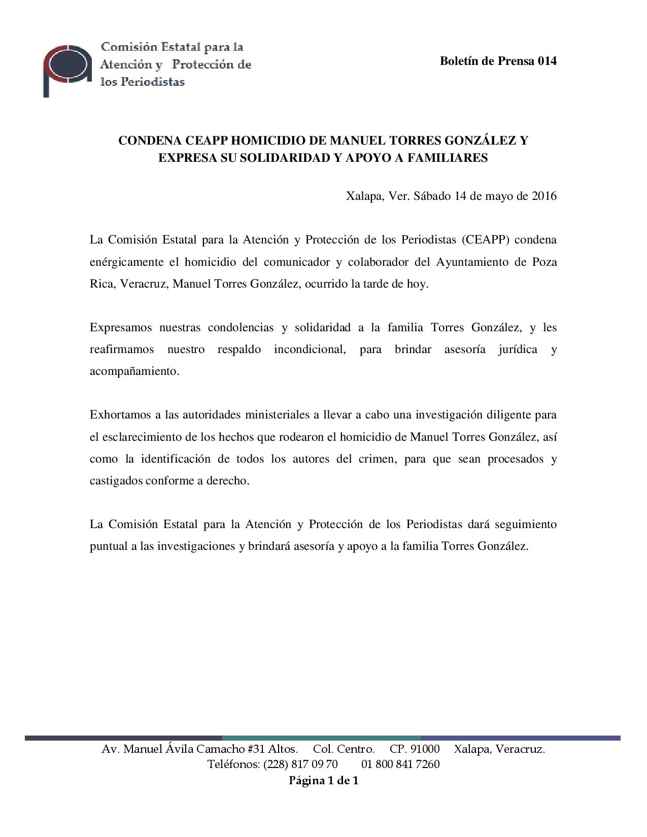 CONDENA CEAPP HOMICIDIO DE MANUEL TORRES GONZÁLEZ Y EXPRESA SU SOLIDARIDAD Y APOYO A FAMILIARES