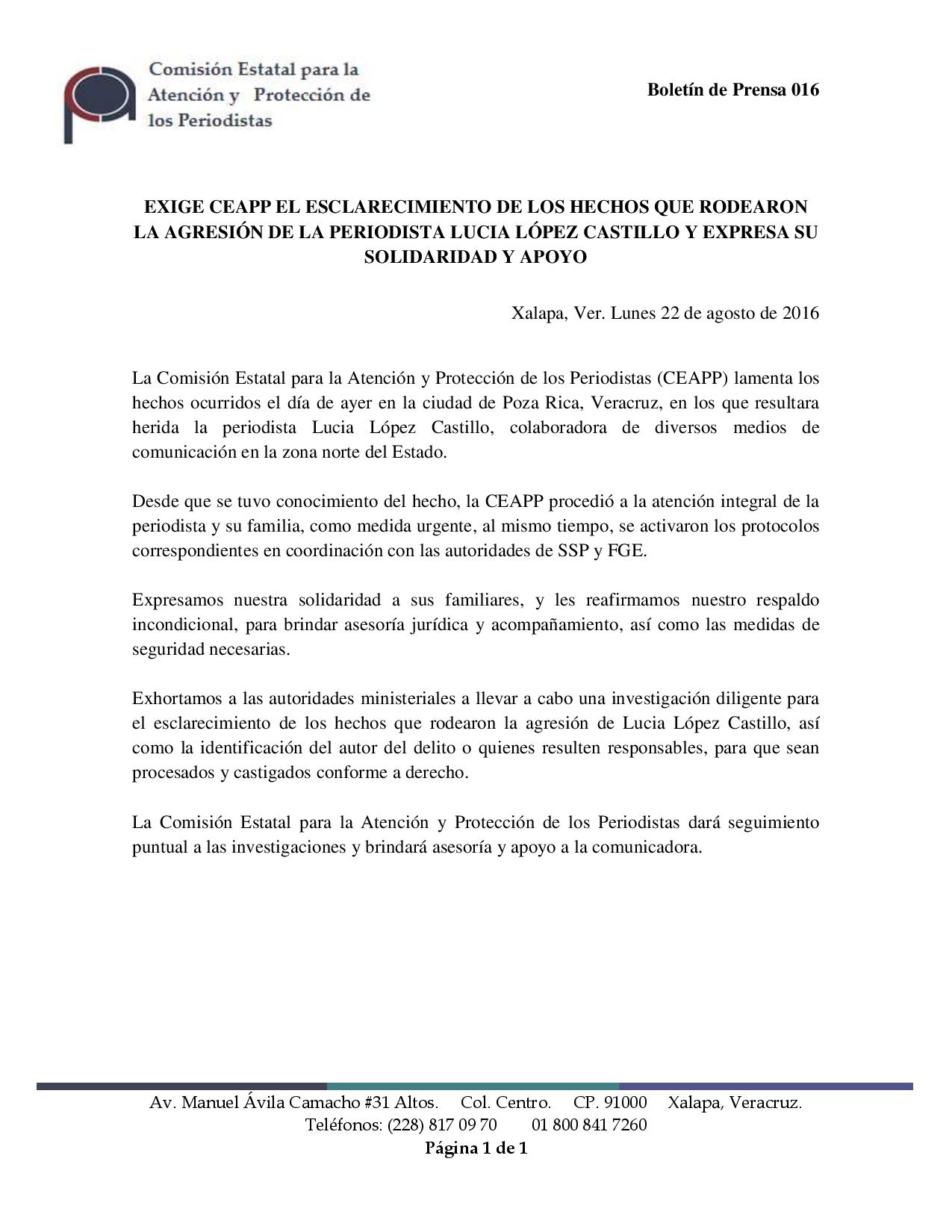 EXIGE CEAPP EL ESCLARECIMIENTO DE LOS HECHOS QUE RODEARON LA AGRESIÓN DE LA PERIODISTA LUCIA LÓPEZ CASTILLO Y EXPRESA SU SOLIDARIDAD Y APOYO